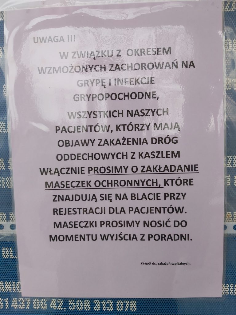 Sezon grypowy w pełni, chociaż – jak ostrzegają epidemiolodzy, prawdziwe apogeum zachorowań na grypę i infekcje grypopochodne dopiero przed nami, bo największa liczba chorujących przypada zawsze na koniec lutego i połowę marca. Aby ustrzec pacjentów, którzy nie chorują na infekcje przed ewentualnym zakażeniem w ich placówce, Przychodnia Certus przy Poznańskiej wprowadziła dla osób kaszlących – które pojawią się w przychodni – maseczki ochronne. – W związku z okresem wzmożonych zachorowań na grypę i infekcje grypopochodne, wszystkich naszych pacjentów, którzy mają objawy zakażenia dróg oddechowych, z kaszlem włącznie – prosimy o zakładanie maseczek ochronnych, które znajdują się na blacie przy rejestracji dla pacjentów – taki apel widnieje na drzwiach wejściowych do Przychodni przy Poznańskiej. Lekarze proszą, by maseczki nosić aż do momentu wyjścia z poradni.