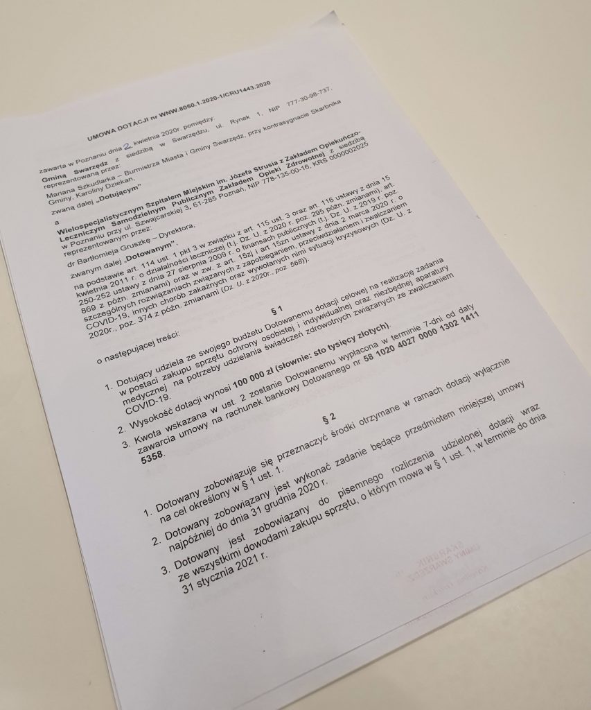 Kilka dni temu burmistrz Marian Szkudlarek zapowiedział przekazanie z budżetu Gminy kwoty 100 tys. zł. na potrzeby Szpitala Zakaźnego w Poznaniu.  W czwartek, 2 kwietnia umowa z placówką została podpisana.  – Burmistrz  Marian Szkudlarek podpisał dzisiaj umowę z Wielospecjalistycznym Szpitalem Miejskim im. Józefa Strusia z Zakładem Opiekuńczo-Leczniczym Samodzielnym Publicznym Zakładem Opieki Zdrowotnej z siedzibą w Poznaniu przy ul. Szwajcarskiej 3, reprezentowanym przez dr Bartłomieja Gruszkę – Dyrektora. Na mocy tej umowy z budżetu Gminy Swarzędz udzielona zostaje dotacja celowa na zakup sprzętu ochrony osobistej i indywidualnej oraz niezbędnej aparatury medycznej na potrzeby udzielania świadczeń zdrowotnych związanych ze zwalczaniem COVID-19 – informuje Maciej Woliński, rzecznik swarzędzkiego ratusza. Wysokość dotacji to  100 000 zł. Kwota zostanie przelana na konto szpitala w ciągu 7 dni od zawarcia umowy.