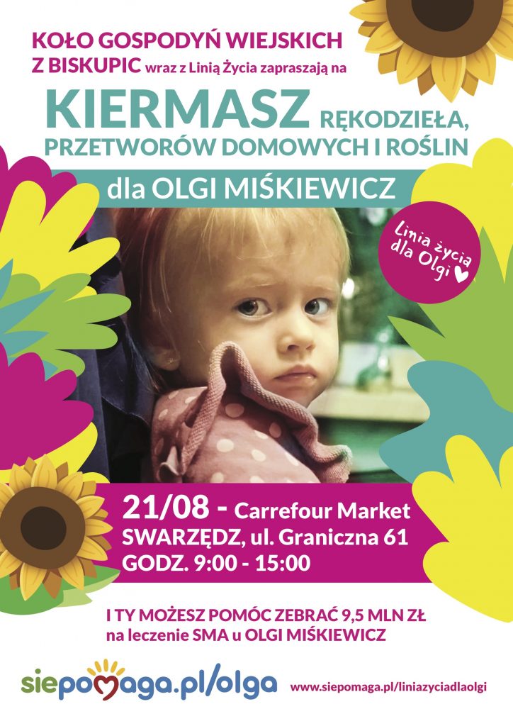 Olga Miśkiewicz ma dopiero kilkanaście miesięcy, a już musi się mierzyć z walką o swoje życie i zdrowie, w nierównym starciu z SMA – bardzo ciężką chorobą genetyczną. Organizm Oldzi nie produkuje białka, które odżywia neurony, odpowiedzialne za pracę mięśni. Mięśnie – odpowiedzialne za ruch, ale też mówienie, połykanie, oddychanie – umierają. Bez leczenia taka choroba to po prostu wyrok. Do tego dochodzi też rdzeniowy zanik mięśni. Jedynym ratunkiem dla Olgi jest terapia genowa najdroższym lekiem świata – jednorazowa dawka leku kosztuje ponad 2 mln dolarów. W pomoc w zbiórkę pieniędzy na lek dla Olgi Miśkiewicz zaangażowała się niemal cała Polska. Zegar jednak tyka niemiłosiernie szybko. Już w sobotę, 21.08. swojego wsparcia Oldze Miśkiewicz będą mogli udzielić też mieszkańcy Swarzędza, bowiem fundacja Linia Życia wraz z Kołem Gospodyń Wiejskich z Biskupic Wielkopolskich, zapraszają mieszkańców na kiermasz rękodzieła, przetworów domowych i roślin. Czekamy na Was w tę sobotę, 21.08.2021r. w godz. 9:00 – 15:00, na terenie Carrefour Market w Swarzędzu, na ul. Granicznej 61.