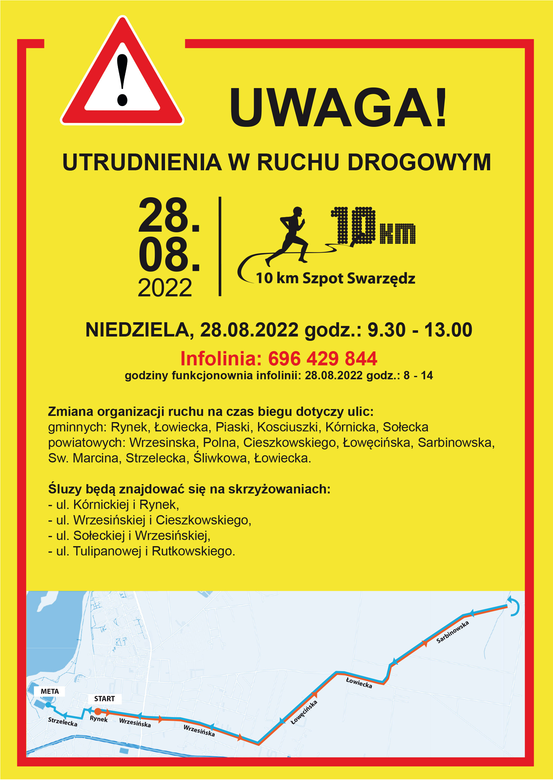 W związku z imprezą biegową kierowcy muszą się  liczyć z utrudnieniami w centrum Swarzędza oraz w Jasinie i Łowęcinie, które potrwają – w zależności od rejonu – w godzinach od 9:00 do 13:00. Trasa Biegu: Rynek – Wrzesińska – Łowęcińska – Łowiecka – Sarbinowska (nawrót) – Łowiecka – Łowęcińska – Wrzesińska – Rynek – Piaski – Strzelecka – św. Marcin – stadion miejski.