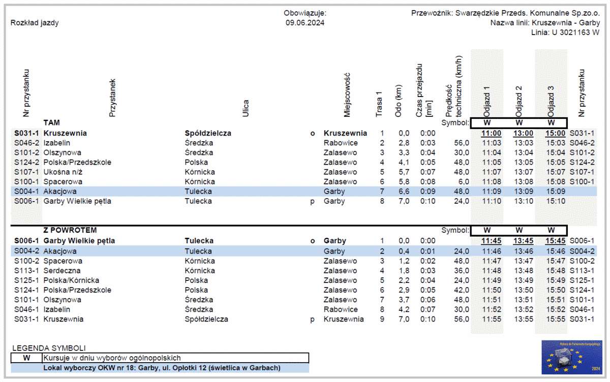 Jak informuje także swarzędzki ratusz, w związku z brakiem połączenia autobusowego między Kruszewnią, a siedzibą Obwodowej Komisji Wyborczej właściwą dla jej mieszkańców (Garby, ul. Opłotki 12), uruchomiona zostanie specjalna linia autobusowa kursujące zgodnie z załączonym rozkładem jazdy.