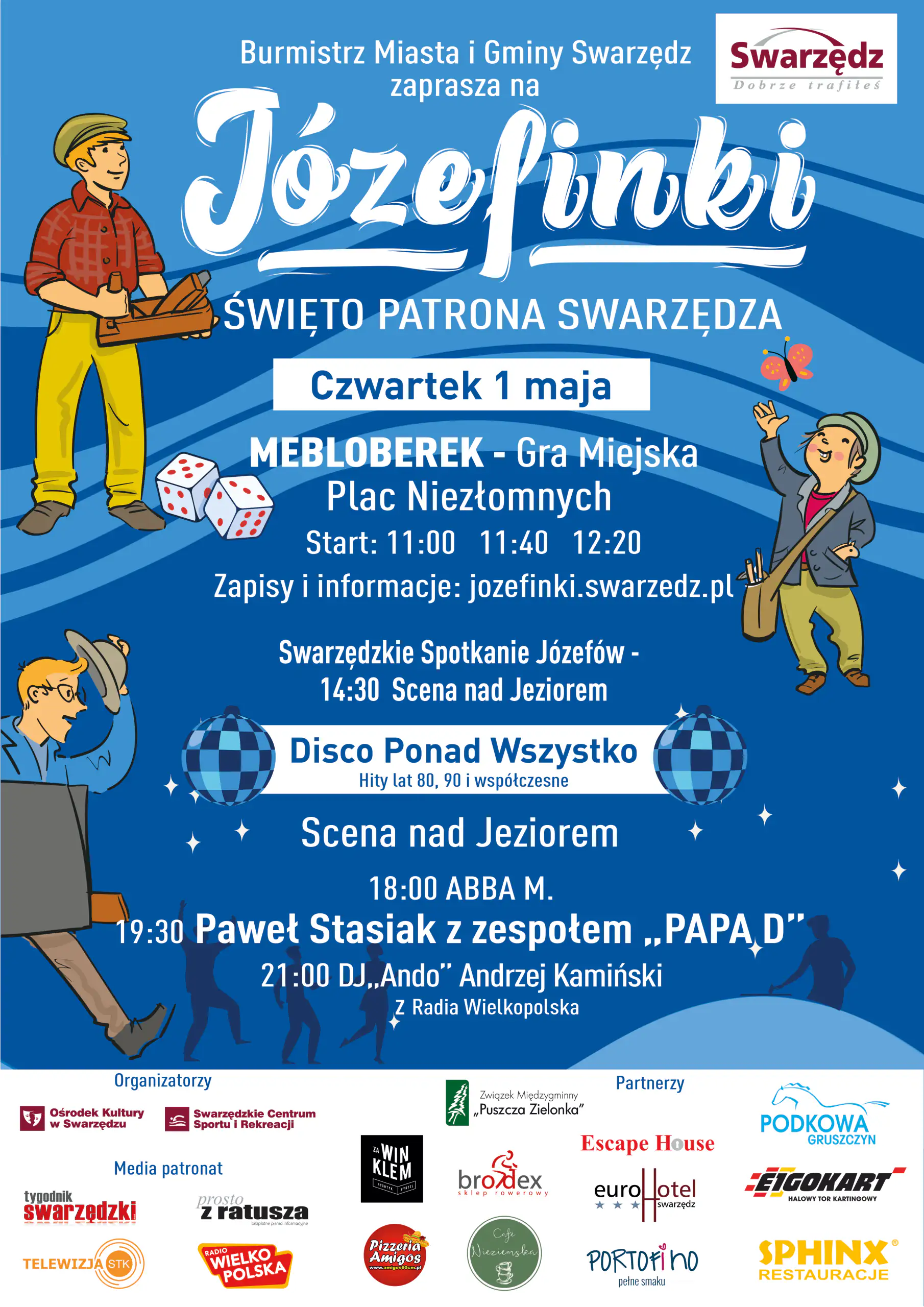 Józefinki odbędą się tradycyjnie 1 maja przy pływalni „Wodny Raj”. Jak informuje swarzędzki Ośrodek Kultury, po kilkuletniej przerwie powraca gra miejska „Mebloberek”. Atrakcyjne nagrody czekają na najlepszych, ale też na szczęściarzy, do których uśmiechnie się los. Nie byłoby jednak Józefinek bez swarzędzkiego Spotkania Józefów! Zapraszamy wszystkich imienników i imienniczki patrona naszego miasta, Świętego Józefa. Tradycyjnie zostanie wybrana Józefa i Józef Roku. Na wszystkich czeka ponadto symboliczny upominek oraz józefowy placek. Zapraszamy o godz. 14:30 – Scena nad Jeziorem przy pływalni „Wodny Raj”. Z kolei wieczorem Swarzędz zamieni się w taneczną stolicę disco! Ośrodek Kultury zaprasza do zabawy przy niezapomnianych hitach. „Disco Ponad Wszystko” to podróż przez dekady muzyki: od kultowych przebojów lat 80. i 90. po współczesne hity, przy których nogi same rwą się do tańca. Gwiazdy wieczoru, od cover-bandu po legendy polskiej sceny muzycznej, zagwarantują fantastyczną atmosferę. O 18:00 wystąpi ABBA M., o 19:30 Paweł Stasiak z zespołem PAPA D., a o 21:00 DJ Ando – Andrzej Kamiński. Zapraszamy!