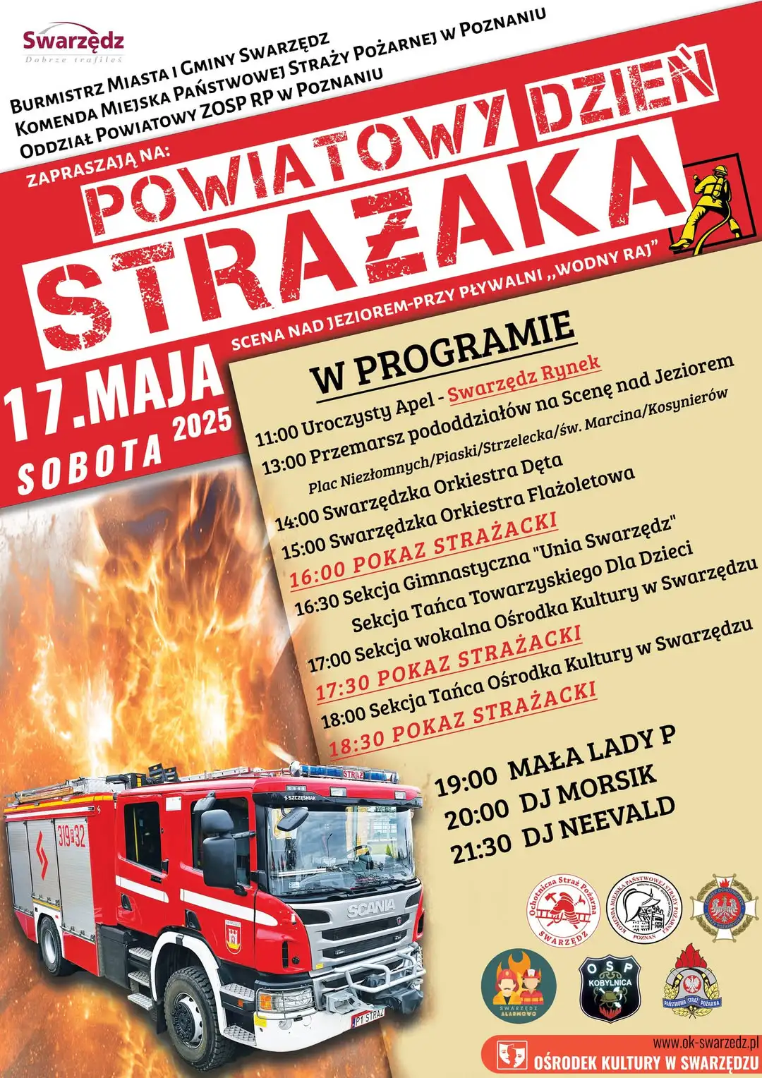 Burmistrz Swarzędza, Komenda Miejska Państwowej Straży Pożarnej w Poznaniu, Oddział Powiatowy ZOSP RP w Poznaniu oraz Ośrodek Kultury w Swarzędzu zapraszają mieszkańców powiatu poznańskiego, strażaków, druhów Ochotniczych Straży Pożarnych oraz sympatyków pożarnictwa na Powiatowy Dzień Strażaka.