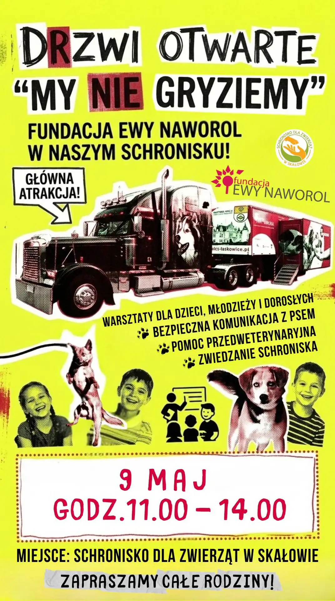 Schronisko dla Zwierząt w Skałowie wspólnie z Fundacją Ewy Naworol zaprasza 9 maja na Dni Otwarte „My Nie Gryziemy". W godzinach 11:00-14:00 będzie można z bliska poznać codzienne funkcjonowanie schroniska oraz jego podopiecznych.